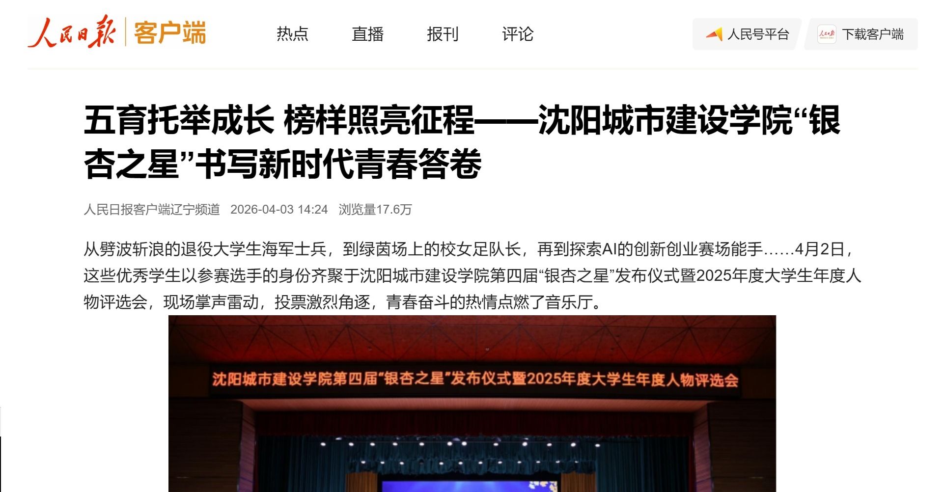 032026-04学校举办“银杏筑梦 星光耀城”沈阳城市建设学院第四届“银杏之星”发布仪式暨2025年度大学生年度人物评选会春风启序,银杏焕新。为选树青春榜样、彰显育人成效,4月2日下午,学校第四届“银杏之星”发布仪式暨2025年度大学生年度人物...2026-04-03 -