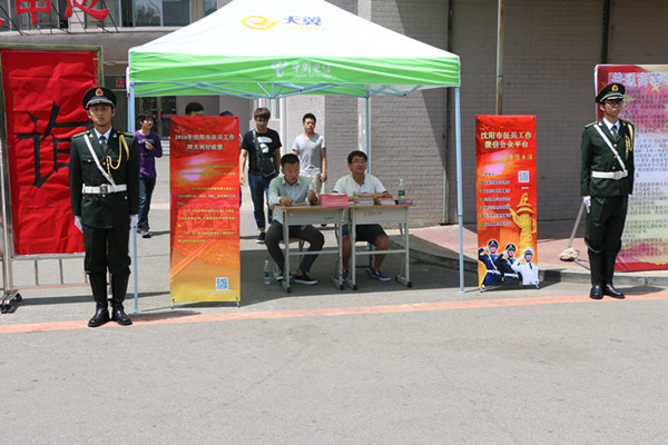 本次活动分别设立在第一食堂广场和第二食堂楼前。活动现场张贴醒目的征兵宣传活动标语,摆放了《普通高等学校毕业生及在校大学生应征入伍相关政策规定》、《2016年沈阳市征兵工作四大利好政策》、《沈阳市征兵工作微信平台推广账号》等展板展架,安排了咨询服务台,由武装部老师为学生答疑解惑。现场还组织了部分学生干部发放征兵宣传单、国旗班成员着装站岗等形式,前来咨询并领取资料的学生络绎不绝。