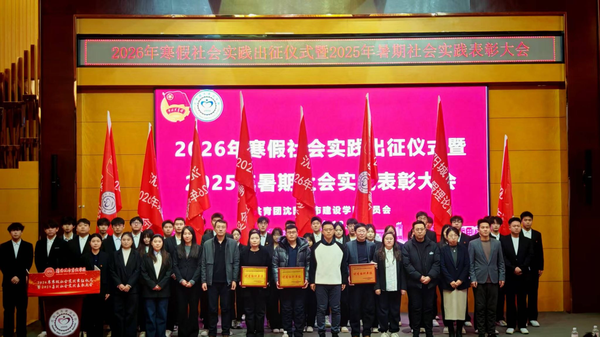校团委书记王长峰为建筑与规划学院、机械工程学院、艺术与传媒学院颁发2025年暑期社会实践优秀组织单位牌匾,并为2026寒假社会实践团队授旗。